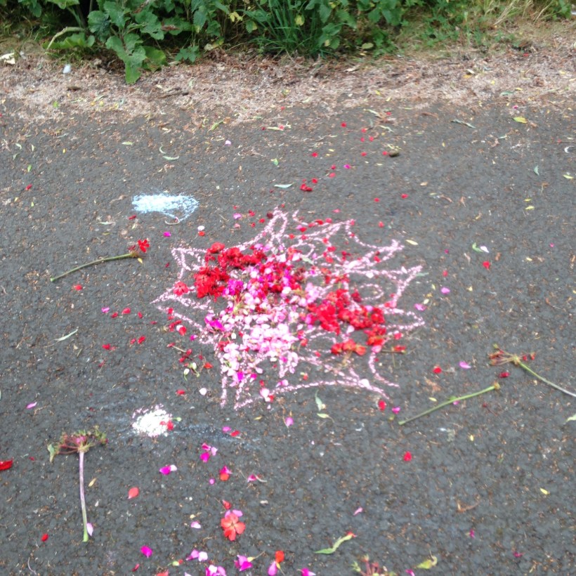 Some of the girls found the chalk set out and went to draw some pictures on the pathway. I had some flowers and added these to the mix, we talked about mandalas and I left them to it. They look so pretty!